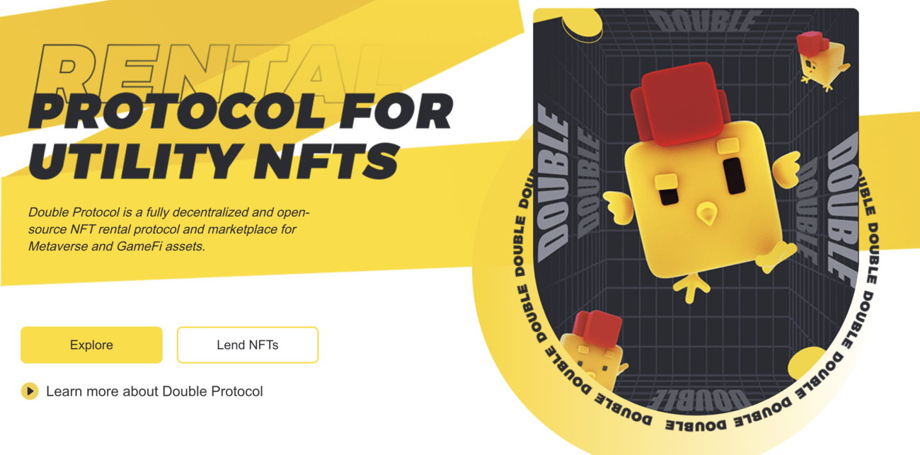 Double Protocol is an open-source protocol for lending and renting ERC-721 and ERC-1155 NFTs. Double created a new rental solution, NFT standard ERC-4907, and ERC-5006, that allow the property rights to be split between the owners and the user.