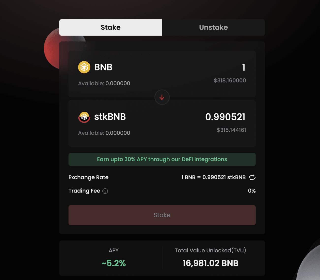 Step 3: Stake BNB, sign the transaction in your wallet and receive stkBNB.