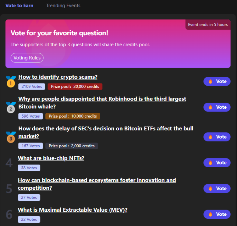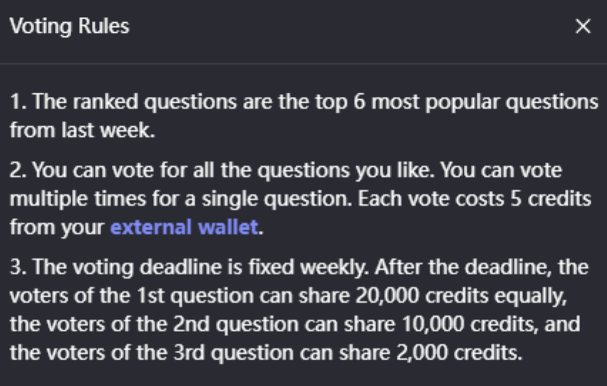 Each week, we will display the 6 most prevalent questions from the preceding week, and the contributors of the top 3 questions, as voted by participants, will divide the allocated 32000 credits (20,000 + 10,000 + 2,000 = 32,000) from the pool. Participants may cast multiple votes for a single question, with each vote deducting 5 credits from their external wallet.